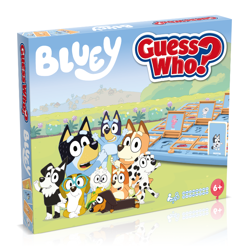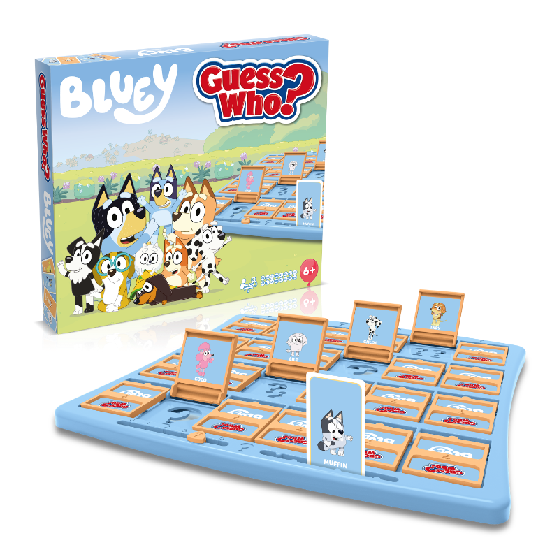 The famous game of deduction now comes with a Bluey twist! Horray! 24 of your favourite characters to discover, so make sure you ask the right questions to win. With every question you ask, eliminate characters from your board, until you're sure you've narrowed down the correct answer. Take a look at Bluey, Bingo, Mum, Dad, and all the other characters in play! Do they have distinctive coat colouring? Do they have fun accessories like glasses or a hat? Can you identify Pom Pom, Uncle Stripe, or Muffin? The classic two-player game of Guess Who? is perfect for any Bluey fan young or old. Hang out with Bluey and her friends with this brand new edition of a beloved classic game.