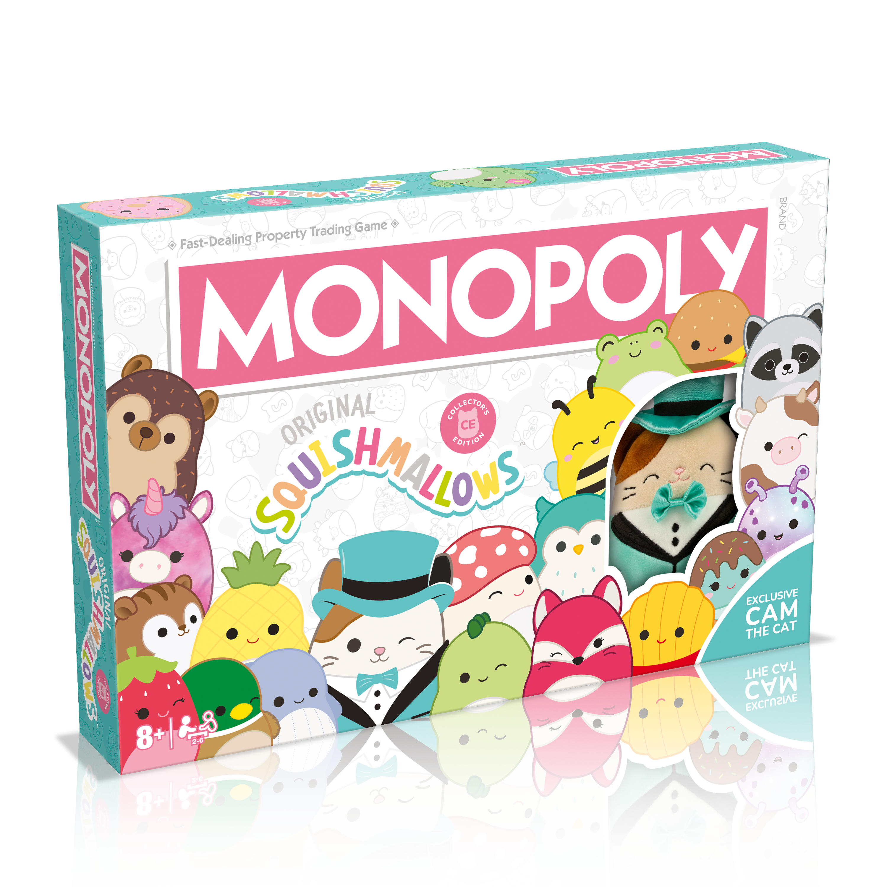 Squad up with the plushiest version of the classic family game you'll ever play! This original Squishmallows Collector's Edition of MONOPOLY lets players buy, sell, and trade their favourites from the Classic Squad to the Fantasy Squad, including Fifi the Fox, Rosie the Pig, Leonard the Lion and Benny the Bigfoot! Start your journey with an exclusive 4" Cam the Cat plush, then pick from one of the iconic custom Squishmallows tokens: will you choose the Headphones, the Rainbow or the Feelin' Mallow logo? Set up valuable Squads and Collections to charge your opponents more rent, and pick up Squish Squad and Mallow Days cards for unexpected prizes and penalties. Will you end up partying with Cam, or stumble across a rare Squishmallows edition? Collect every space on the board and outsmart your opponents to be the last one with Squishcash and win the game! Just watch out for those tax spaces and try not to end up in Jail!