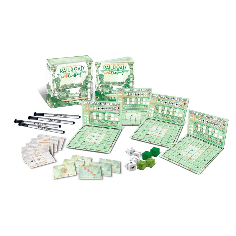 Railroad Ink Challenge comes in two versions, each one including one expansion with an additional dice set that adds new special rules to your games. Create placid forest landscapes and build into a beautiful arboreal paradise with the Lush Green Edition!