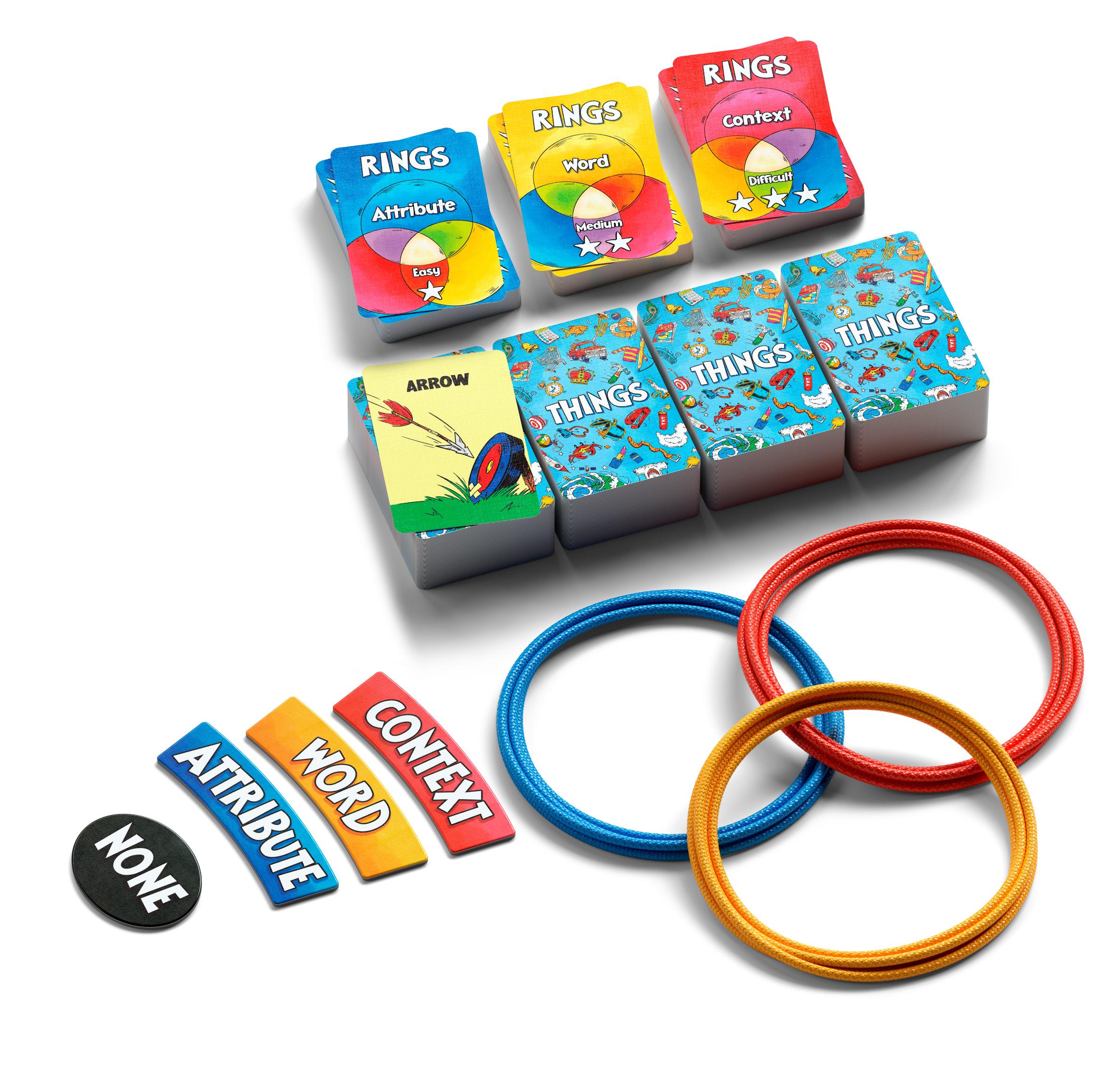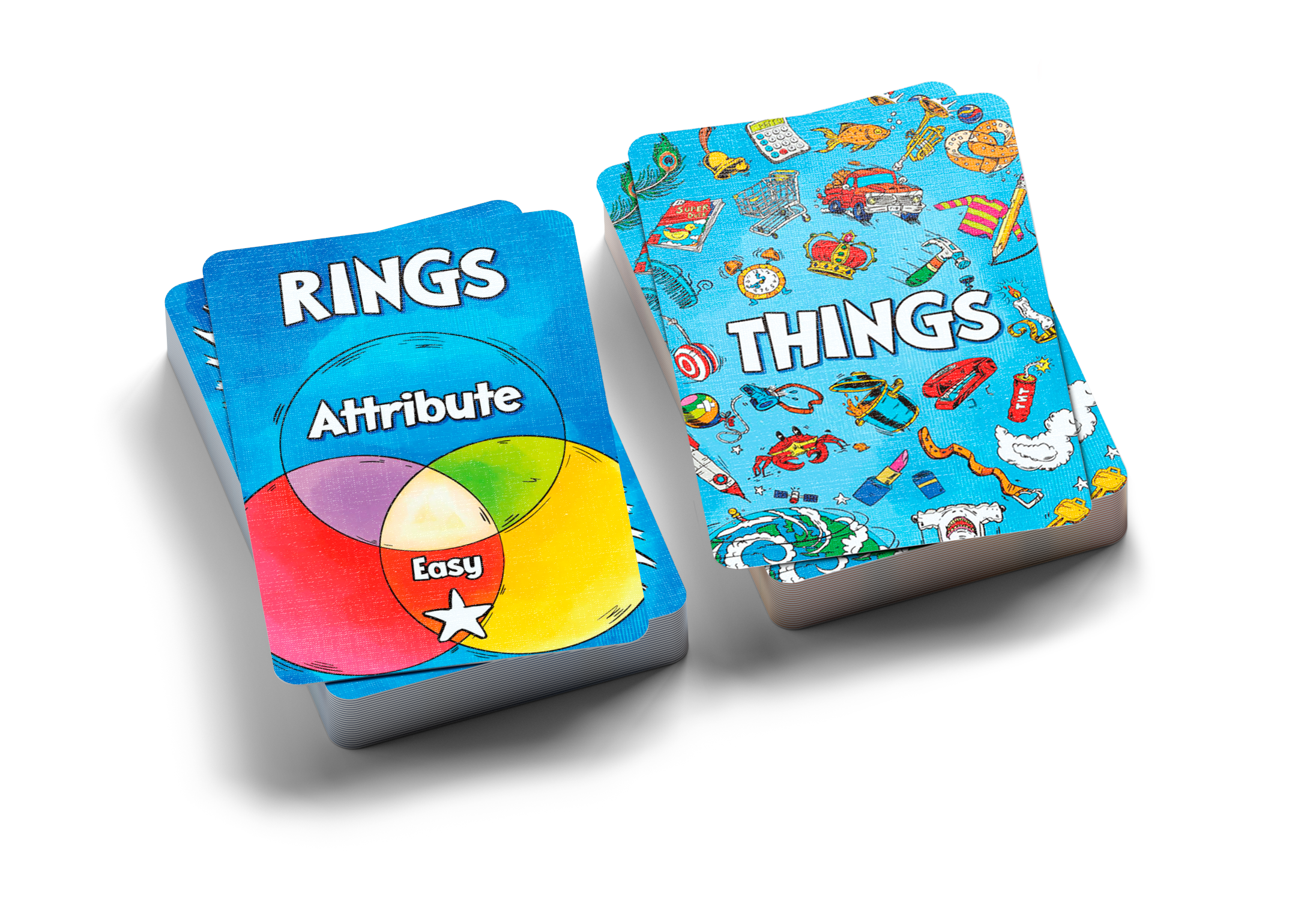 The point of the game is to get rid of all of your cards. Can you figure out the Rings' logic before your opponents? Don't forget, you can play in the overlapping spots of the Venn diagram, or even outside it completely!