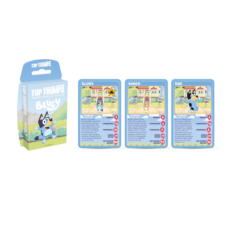 Ready to play with everyone's favourite adventurous girl? You and your friends can with this all new edition of Top Trumps! Join Bluey, Bingo, and all their friends and family to see who can become the Top Trump. Challenge others and find out who is the most cheeky, or who has the best dance moves, or who is the most energetic! Can Uncle Rad's funniness outrank Dad's? Or does Pom Pom have more energy than Muffin? This game is not trifficult and it sure is exciting to play with friends. Grab your mates and see who can win with this all new Top Trumps Bluey edition! Hooray!