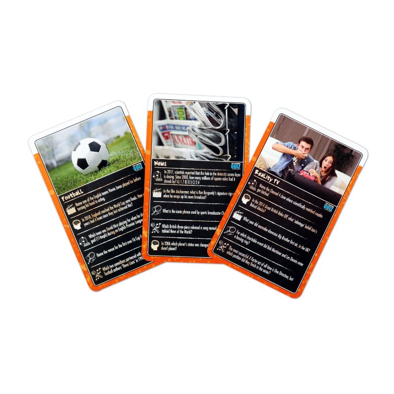With 500 questions on 5 different categories: Sports, Music, Film and TV, Science and General Knowledge; and with cards on every subject from Art, Animals, Adverts and Acronyms, to Toys, Transport, Technology, and Theme Tunes, with Decades, Food and Drink, and even Weather covered along the way, there's something to test the brains of all ages and interests!