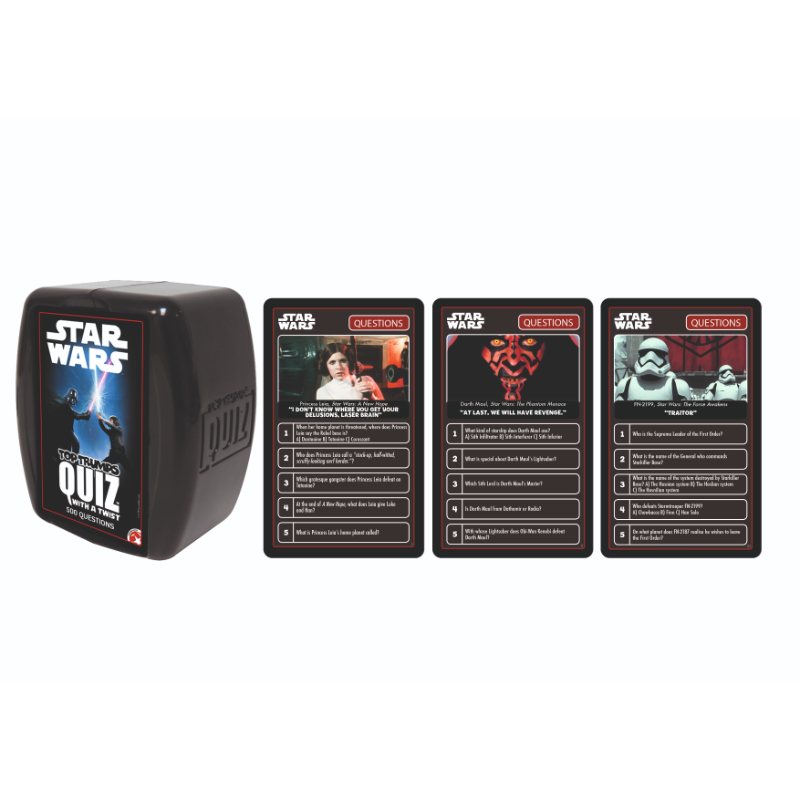 Are you a Star Wars expert? Can you identify the difference between Episodes 3-6 and Episodes 1-3? Can you remember specific scenes from Episode 7: The Force Awakens? Travel to a galaxy far, far away and test your Star Wars knowledge to see if you are a force to be reckoned with! With 500 questions to answer, Top Trumps Quiz is great for the whole family, whether you want a quick game on the go or to spend some time seeing how much you really know! With a Top Trumps twist at the end to test your memory, can you remember what you learned just moments ago?