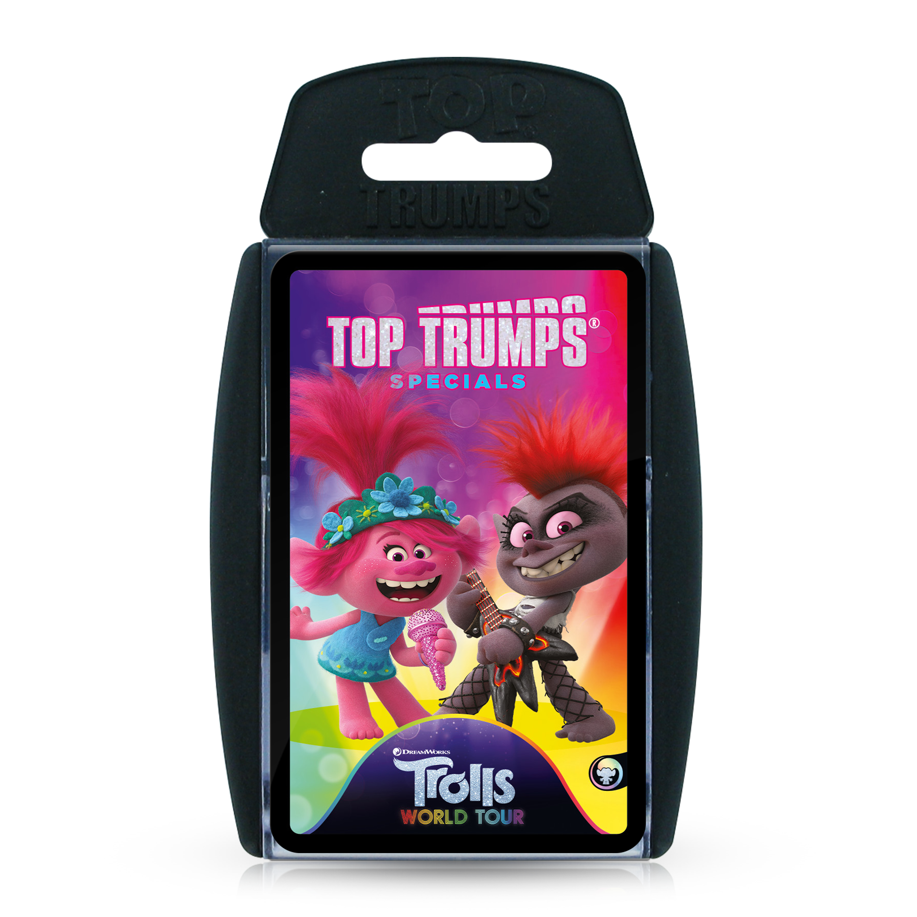 The harmony of the Troll Universe is thrown into chaos when Queen Barb of the Rocker Trolls attempts to erase other kinds of music forever! Join Queen Poppy, Branch, Biggie, Delta Dawn and their friends as they journey through the six Troll Kingdoms to unite the scattered tribes in this exciting new edition of Top Trumps - Trolls World Tour.