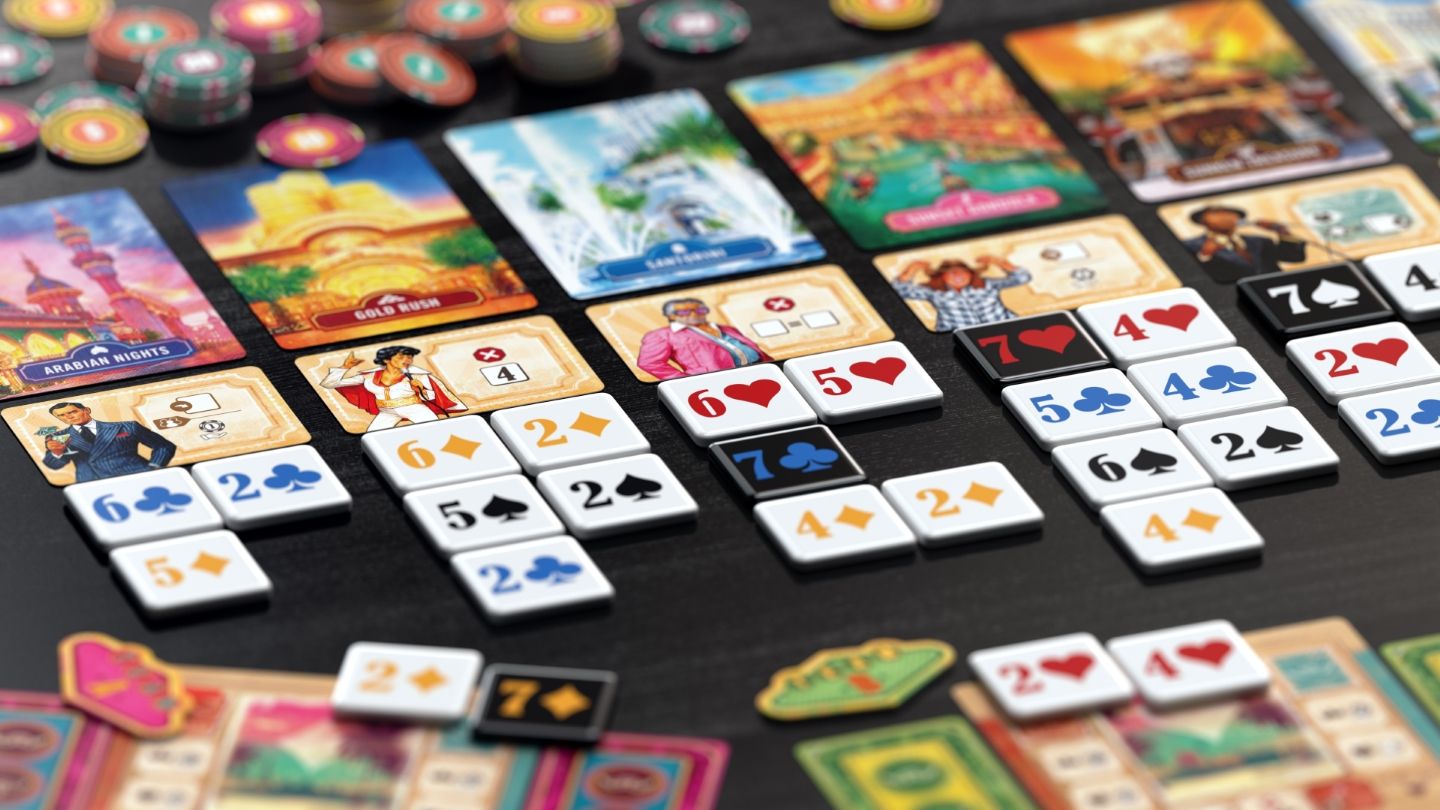 In this 2-6 player bluffing game, players have hidden information about which casinos are corrupt. Take turns playing money tiles (two 2’s, two 4’s, one 5, one six, one seven) into the different casinos.